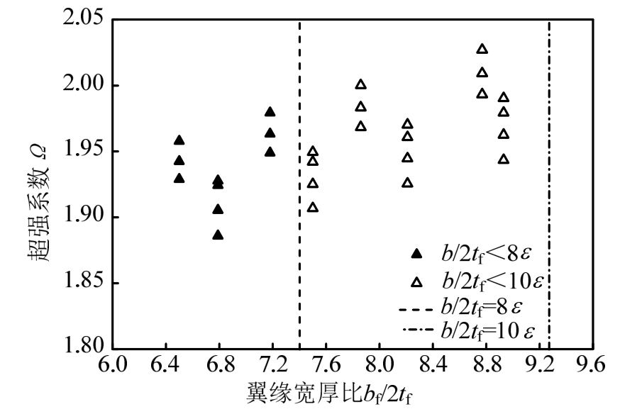 图12为短剪切型消能梁段的翼缘宽厚比与超强系数的关系图。左边竖直虚线是允许的翼缘宽厚比bf/ 2tf= 8ε,右边虚线的bf/ 2tf=10ε。当翼缘宽厚比满足规范要求时,其超强系数的最小值为1.90;放宽翼缘宽厚比至 10ε时,翼缘面积的增大会提高翼缘对腹板的约束作用和子框架的承载能力。另外,由于构件端部弯矩较小,增大翼缘宽度不会引起翼缘屈曲,使其超强系数有所增大,均不小于1.92。