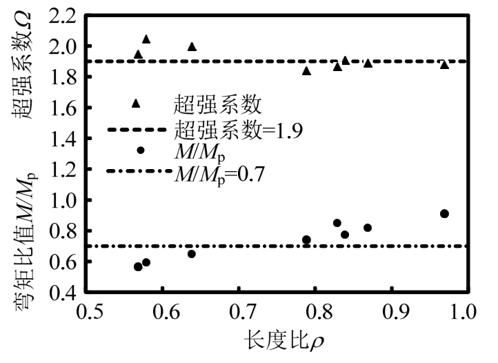 当消能梁段长度比小于1.0时,腹板将发生全截面受剪屈服,且子框架有较大的承载能力,使其超强系数的最小值为1.80,平均值为1.90,大于规范建议值1.50。此外,由于消能梁段长度较短,当其剪力达到极限状态时的端弯矩M与塑性弯矩Mp的比值小于0.90,平均值为0.70,如图1所示。