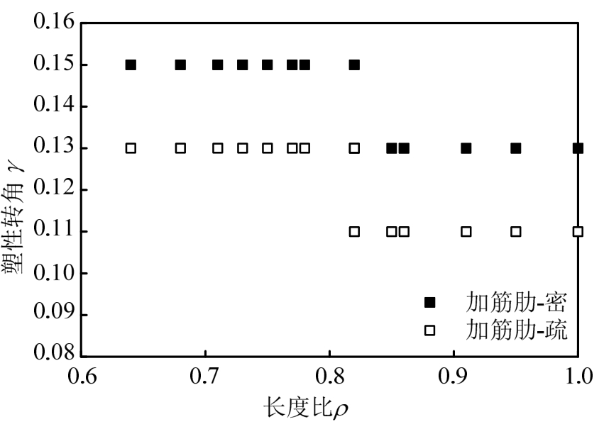 另外,考虑多种因素影响时短剪切型消能梁段的长度比与塑性转角关系如图21所示。从图中可知,长度比和加劲肋间距是影响其塑性转角的主要因素。当加劲肋间距系数满足规范要求时,考虑多种因素影响下构件的塑性转角最大值为 0.15,最小值为0.13;放宽加劲肋间距系数至40时,其塑性转角最大值为0.13,最小值为0.11,大于规范值0.08。