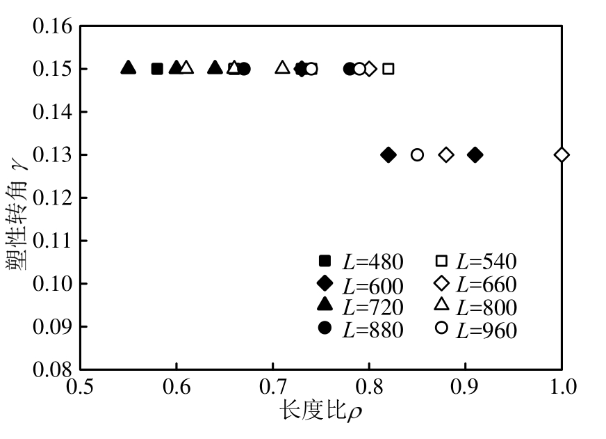 往复荷载下,短剪切型消能梁的跨高比、长度比和塑性转角关系如图19所示。对相同塑性剪力和长度的模型,由跨高比引起的长度比变化对其塑性转角无明显影响。因此,改变跨高比对构件力学性能无明显影响。由于增大跨高比可提高构件的塑性模量和抗弯承载力,设计时宜尽量提高其跨高比。