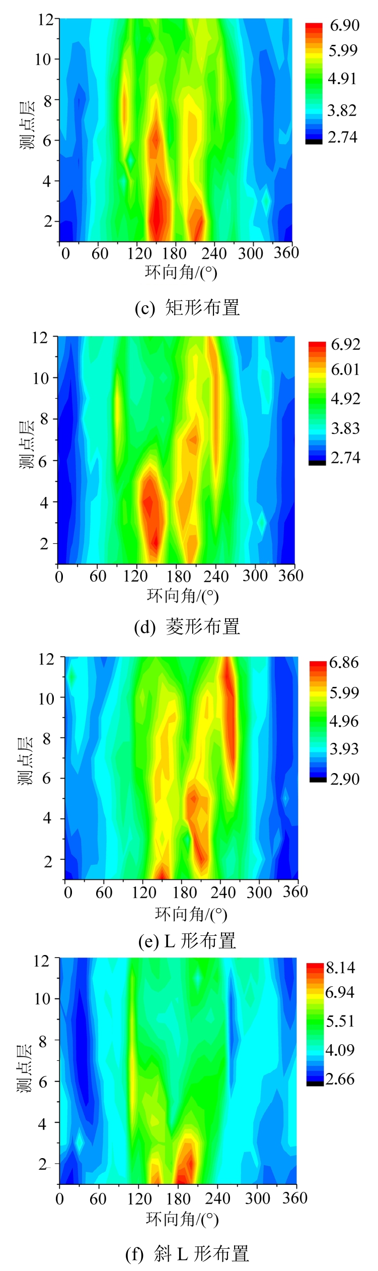 Fig.12 2-D distribution of peak factor of different layouts under the most unfavorable condition