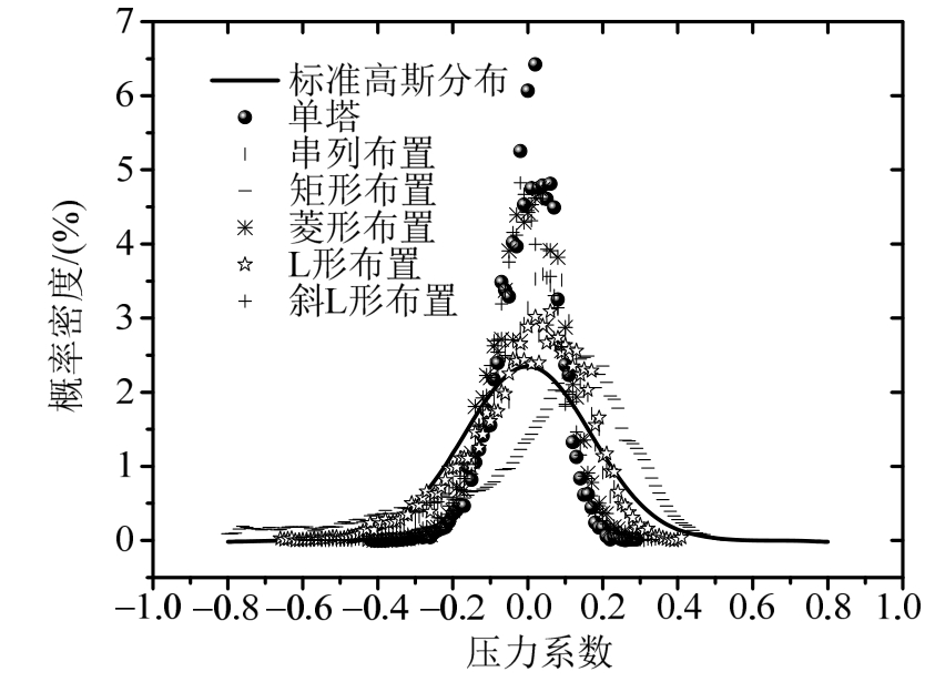 图10列举了单塔和五种四塔组合最不利干扰工况冷却塔喉部分离点风压信号概率密度分布图。由图可见,上述测点信号均明显偏离标准高斯分布,更多风压信号的概率密度分析表明四塔干扰下冷却塔测点中出现类似“大偏斜”和“高峰值”特征的风压信号占有较大比例。