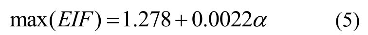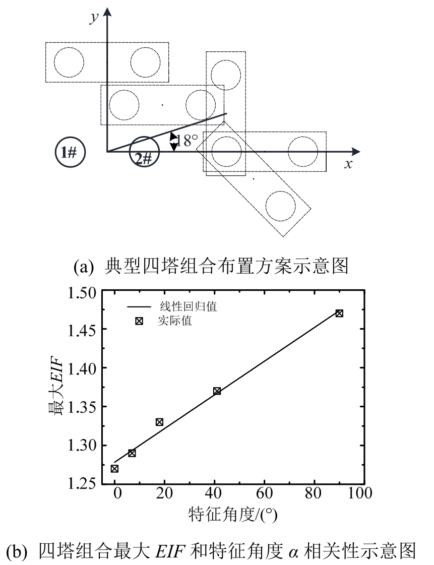 图7(a)汇总给出了五种典型四塔组合形式布置方案,将 1#和 2#塔作为已固定位置的冷却塔,并视为一个整体(塔群A),3#和4#塔作为塔群B。五种典型四塔组合方案的不同在于塔群A与塔群B相对位置的改变,定义塔群A中心位置点与塔群B中心位置点连线相对图中x轴的夹角为四塔组合形式的特征角度α(取绝对值),L形方案特征角度α=18°,如图所示。图7(b)给出了四塔组合冷却塔最大EIF和特征角度α相关性示意图,对比发现:两者存在很好的线性相关性,相关系数为0.99,图中回归关系如式(5)所示。分析可知,当特征角度增大时(α≤90°)四塔组合的整体风荷载干扰效应将持续增加。