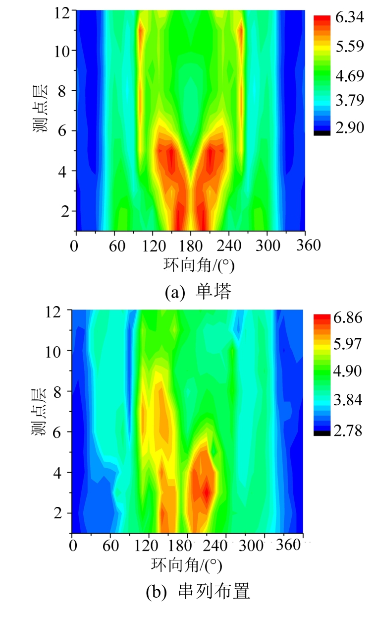 图13给出了单塔和五种四塔组合最不利干扰冷却塔峰值因子分布云图。由图可知,四塔干扰下冷却塔表面峰值因子分布均呈非对称分布,且峰值因子最大值常发生于塔筒底部,除串列布置外最大峰值因子均达到6.5以上。矩形、菱形和L形布置峰值因子分布规律相近,均在塔筒底部和喉部高度附近达到峰值。斜L形方案峰值因子仅在塔筒底部达到最大值7.6,其余区域峰值因子均较小。