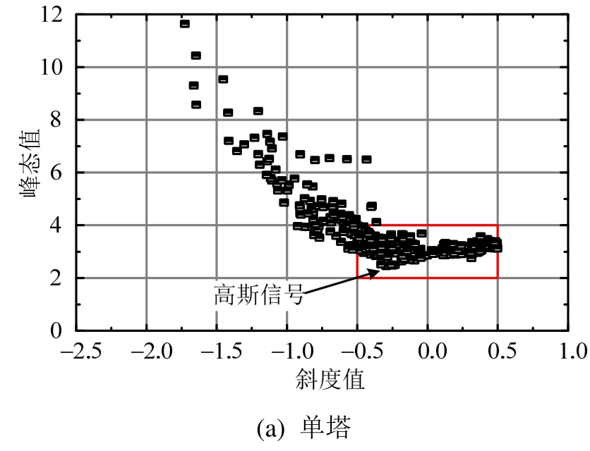 参考已有研究[12―13]将-0.5≤μssk≤0.5 且 2≤μsku≤4的测点信号近似看作高斯信号(μssk和 μsku分别代表风压信号的斜度值和峰态值),图11统计给出了单塔和五种四塔组合最不利干扰工况所有测点的斜度和峰态关系图。分析可知,单塔、串列和斜L形方案下冷却塔各测点风压信号的斜度值和峰态值分布更为集中;串列、矩形、菱形、L形和斜L形四塔组合最不利工况下冷却塔风压信号分别有30%、44%、42%、51%和35%的测点属于非高斯信号,而单塔工况仅有26%的测点风压信号属于非高斯信号。四塔干扰效应对冷却塔局部风压信号的非高斯特性影响显著,极值风荷载计算中的峰值因子取值需进一步探讨研究。