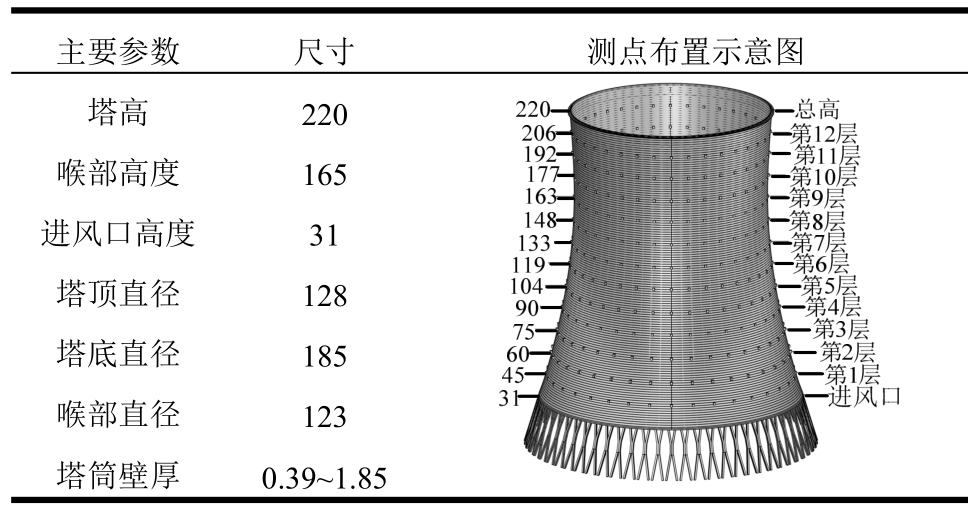 表1 冷却塔主要结构尺寸和测点布置 /m