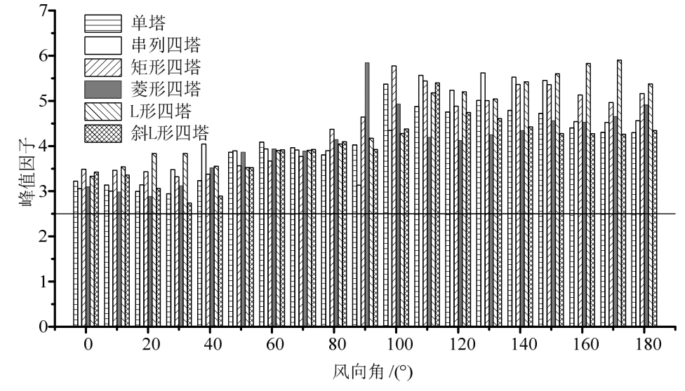 图12给出了采用Sadek-Simiu法计算得到的峰值因子二维分布示意图,图中直线代表规范[15]给出的峰值因子统一取值2.5。由图可知:1)除迎风区(0°≤θ≤40°)测点峰值因子较小之外,侧风区(40°≤θ≤120°)和背风区(120°≤θ≤180°)测点峰值均明显偏离规范数值,这两个区域的脉动风压占极值风压的比例较大,按规范峰值因子取值将严重低估极值风压;2)五种四塔方案中与单塔峰值因子分布较为接近的是串列和斜L形方案,矩形、菱形和L形方案峰值因子相对单塔工况增幅较大。