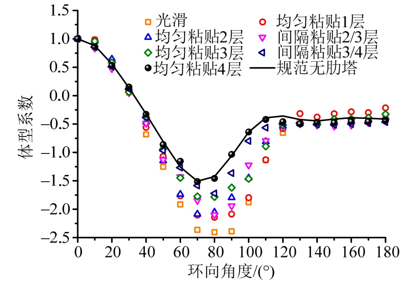 为进行冷却塔模型试验的雷诺数效应修正,风洞试验中采取在冷却塔外表面等间距粘贴 36条5 mm宽、0.15 mm厚粗糙纸带和调整试验风速(8 m/s~14 m/s)的手段进行雷诺数效应补偿。共测试了以下7种粗糙度工况:① 表面光滑;② 均匀粘贴1层;③ 均匀粘贴2层;④ 间隔粘贴2/3层;⑤ 均匀粘贴3层;⑥ 间隔粘贴3/4层;⑦ 均匀粘贴4层粗糙纸带。图2给出了风速为10 m/s时不同粗糙度冷却塔喉部高度体型系数分布曲线,并与规范建议风压曲线[5]进行对比。由图可见,于模型外表面均匀粘贴4层粗糙纸带可以较好地实现冷却塔雷诺数效应模拟,最终措施如图3所示。