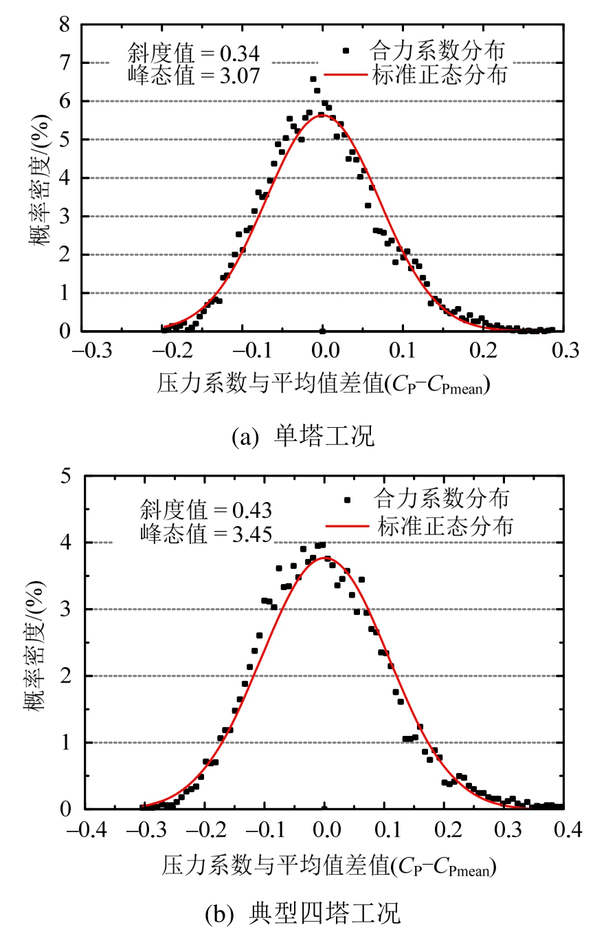 图5给出了单塔和典型四塔组合工况(菱形布置 247.5º风向角下2#塔)的合力系数时程概率密度曲线。单塔工况合力系数时程的斜度值和峰态值分别为0.34和3.07,四塔工况的斜度值和峰态值分别为0.43和3.45。针对更多四塔工况合力系数进行数理统计,结果均表明四塔工况的合力系数概率密度分布均与正态分布吻合较好。合力系数是冷却塔表面所有测点风压的集合,根据中心极限定理[17]可知合力系数的概率密度分布较单个测点的风压信号更偏向高斯分布。