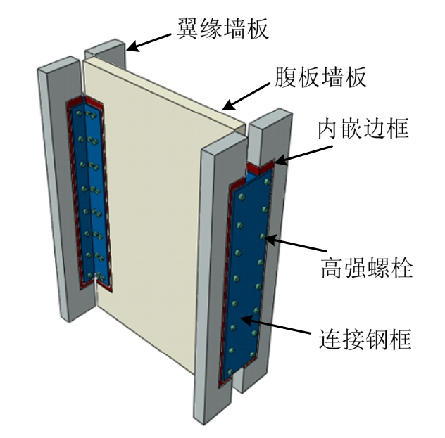 在该干连接全装配式剪力墙中,内嵌边框、连接钢框、高强度螺栓的功能分别如下[17]: