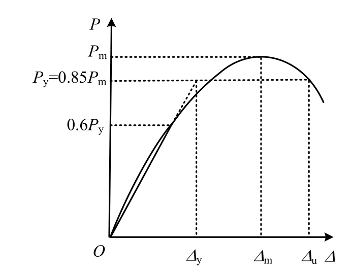 采用两种方法确定试件的屈服位移和屈服荷载:1)根据荷载-位移关系结合试件受拉侧最外排竖向钢筋应变综合判断,取荷载-位移曲线出现拐点或试件最外排竖向钢筋屈服时的位移为屈服位移,对应荷载为屈服荷载;2)采取文献[22]方法,即屈服荷载Py取试件峰值承载力Pm的85%,连接原点与P-Δ曲线上的0.6Py点,并延伸至水平线P=Py,二者交点对应的位移为Δy,如图11所示。