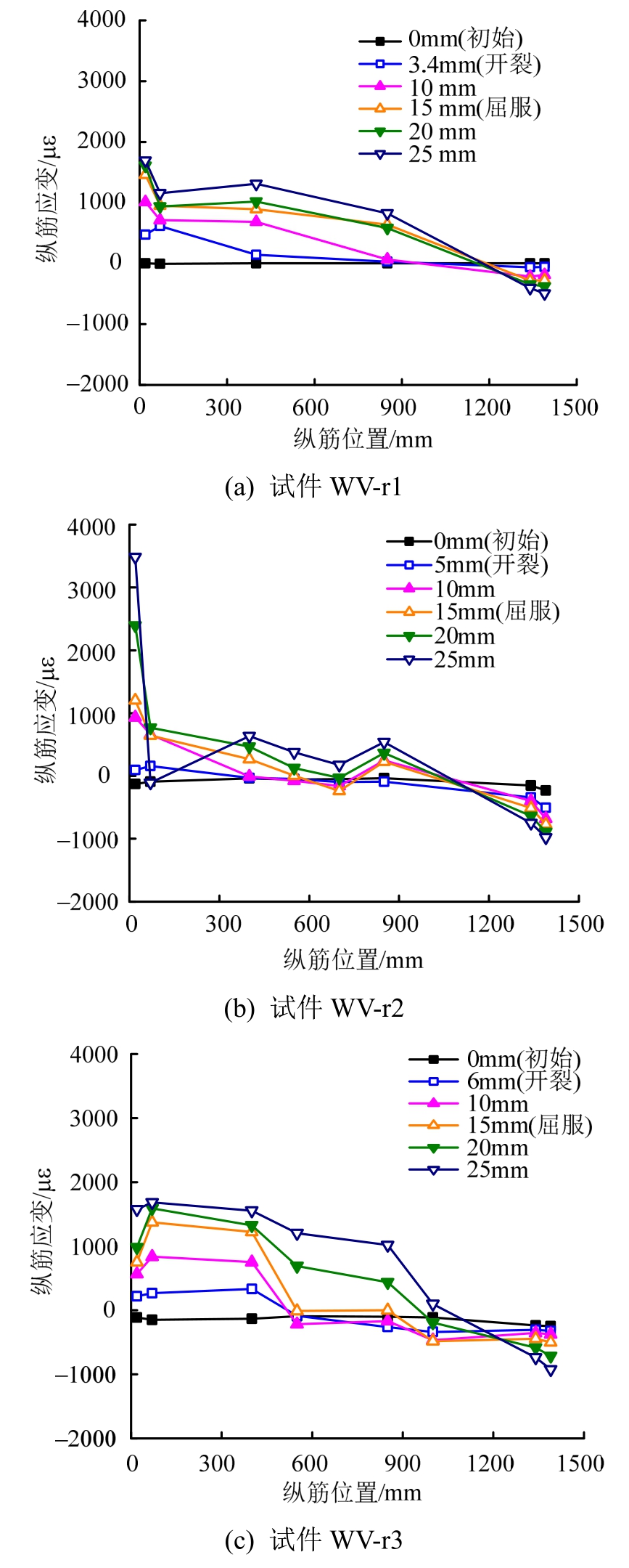 试件 WV-r1~WV-r3中翼缘墙板与腹板墙板底截面处,不同顶点侧移时竖向钢筋的应变的分布如图15所示,图中坐标0表示试件受拉端、受压端的坐标为1400 mm。从该图可以看出,在不同加载阶段,试件底部截面的纵筋应变基本呈线性分布,既验证了平截面假定,也说明了翼缘与腹板的协同工作性。