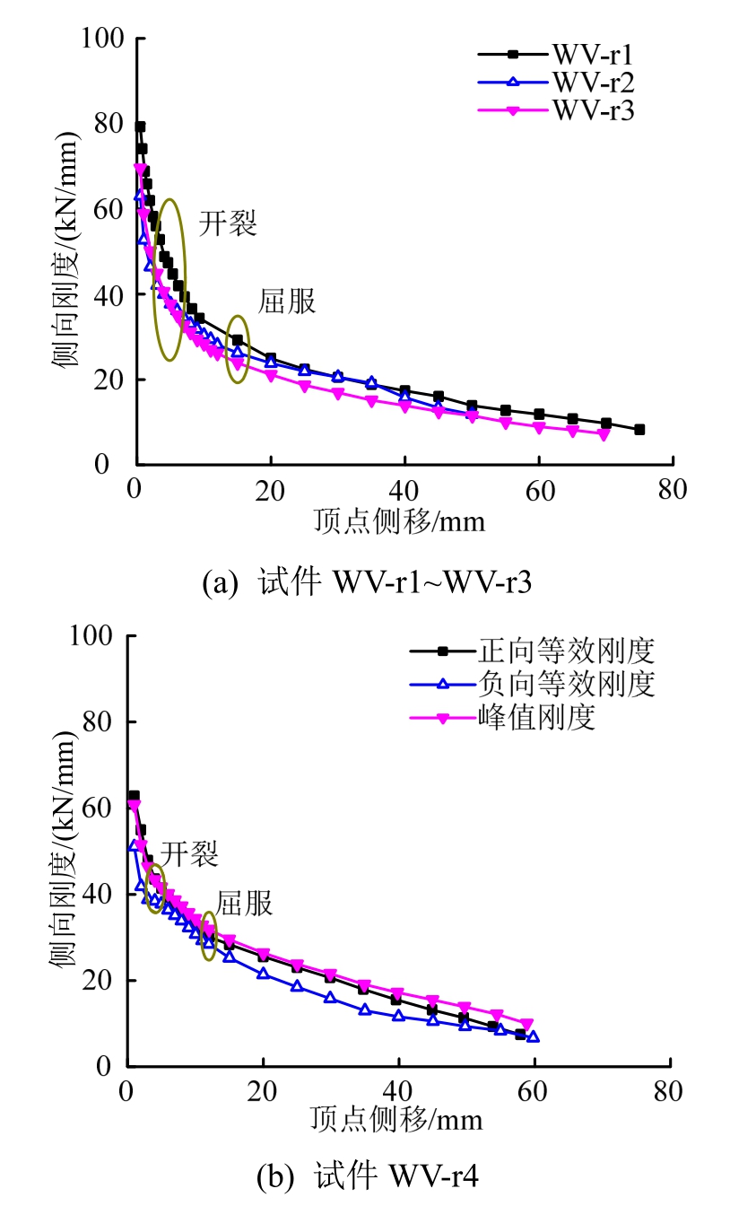试件WV-r1~WV-r4的刚度退化曲线见图13。由该图可以看出:1)试件WV-r1~WV-r4的侧向刚度变化趋势基本一致,均随顶点侧移的增大而下降,大致可由混凝土的开裂和试件的屈服分为三个阶段。从开始加载至出现可见裂缝,刚度退化速率较大、刚度降低约40%,这主要是混凝土内微裂缝的发展所致;自开裂至屈服,刚度进一步退化,但退化速率比开裂前有所降低;屈服后,刚度基本呈线性退化;2)低周反复荷载试验时,正、负向等效刚度与峰值刚度的衰减趋势一致;3)试件WV-r2、WV-r3的初始刚度略小于WV-r1,表明具有较强连接件的试件具有较大的侧向刚度。