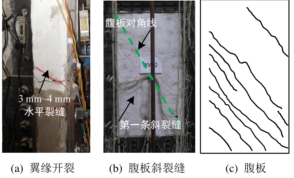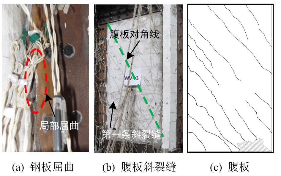 水平位移为6 mm之前,试件WV-r3处于未裂弹性状态;加载至6 mm时,受拉翼缘根部出现第一条水平裂缝;之后随着水平位移的增加,受拉翼缘下部出现若干条水平裂缝并不断扩展;加载至8 mm时,腹板出现第一条斜裂缝,倾角约为45°;水平位移为8 mm~12 mm时,受拉翼缘根部的水平裂缝宽度增加,腹板上第一条斜裂缝延伸至腹板受压角区,同时腹板出现新的斜裂缝;水平位移为12 mm~45 mm时,受拉翼缘根部出现新的水平裂缝,原有水平裂缝宽度扩展,腹板出现新的斜裂缝,同时原有斜裂缝向腹板受压角区延伸;水平位移为45 mm~75 mm时,受拉翼缘水平裂缝与腹板斜裂缝基本开展完毕,宽度随水平位移的增大而增大,腹板受压角区混凝土受压鼓起、不断剥落,期间当水平位移为60 mm~65 mm时,受压侧连接钢框腹板发生屈曲,位置在距钢框底部550 mm~700 mm处;最终,腹板受压角区混凝土压溃,竖向钢筋压屈并裸露,高强度螺栓未破坏,受压翼缘破坏程度低于腹板受压角区。试件WV-r3的破坏形态如图8所示。
