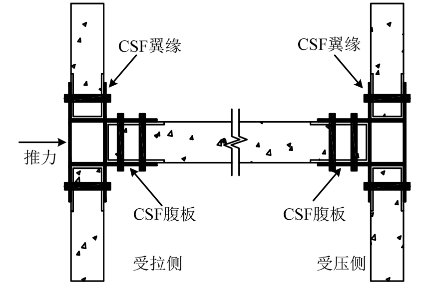 在装配式剪力墙结构中,竖向接缝的作用主要在于将相邻的纵、横向墙体连接为一体,确保剪力的有效传递[1],因此试验中对连接钢框的竖向剪应变进行了测量。为便于讨论,对水平推力作用下试件中连接钢框(connecting steel frame, CSF)的各部位的名称进行说明,如图16所示。
