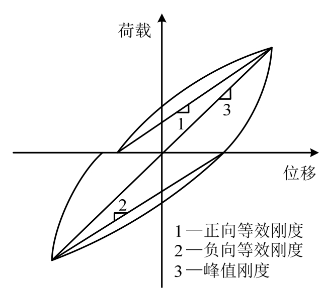 随着试件顶点侧移的不断增加,试件中的损伤累积会造成侧向刚度逐渐降低。对于单调加载试验,定义其侧向刚度为各级荷载下作用在试件顶部的水平荷载与对应的水平位移之比。对于低周反复荷载试验,引入两种侧向刚度[22],如图12所示:第一种称为等效刚度,即在一个加载循环中荷载峰值点与加载起始点连线的斜率,有正、负向等效刚度之分;第二种称为峰值刚度,即一个加载循环的正反向加载峰值点连线的斜率。