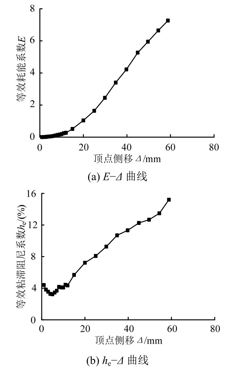 在反复荷载作用下,试件的能量耗散能力可以由荷载-位移滞回曲线所包围的面积来衡量,滞回环的面积受到强度和刚度退化的影响。本文采用等效耗能系数(E)和等效粘滞阻尼系数(he)两个参数分析试件的耗能性能,二者的定义见文献[22]。滞回环越饱满,E、he值越大,表明试件耗能能力越强。