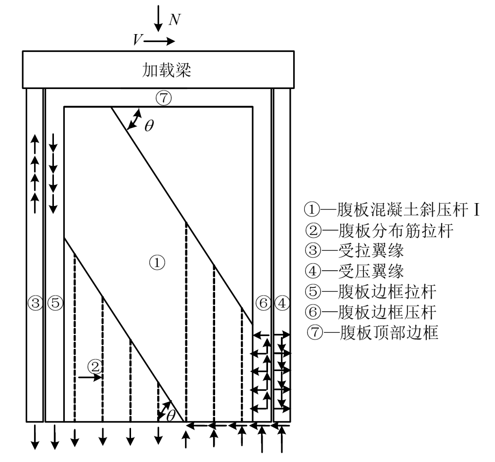 在低周反复荷载作用下,试件 WV-1、WV-2发生了腹板斜压杆受压破坏-翼缘根部剪切破坏的联合破坏模式[17],一定程度上影响了工字形全装配式剪力墙的抗震性能,尤其是延性性能,因此在试件 WV-r1~WV-r4设计时进行了一定的改进。上述试验结果表明,改进后工字形全装配式剪力墙的抗震性能得到了较大的提高。本节重点分析改进后的工字形全装配式剪力墙试件 WV-r1~WV-r4在受剪承载能力极限状态下的受剪机制。