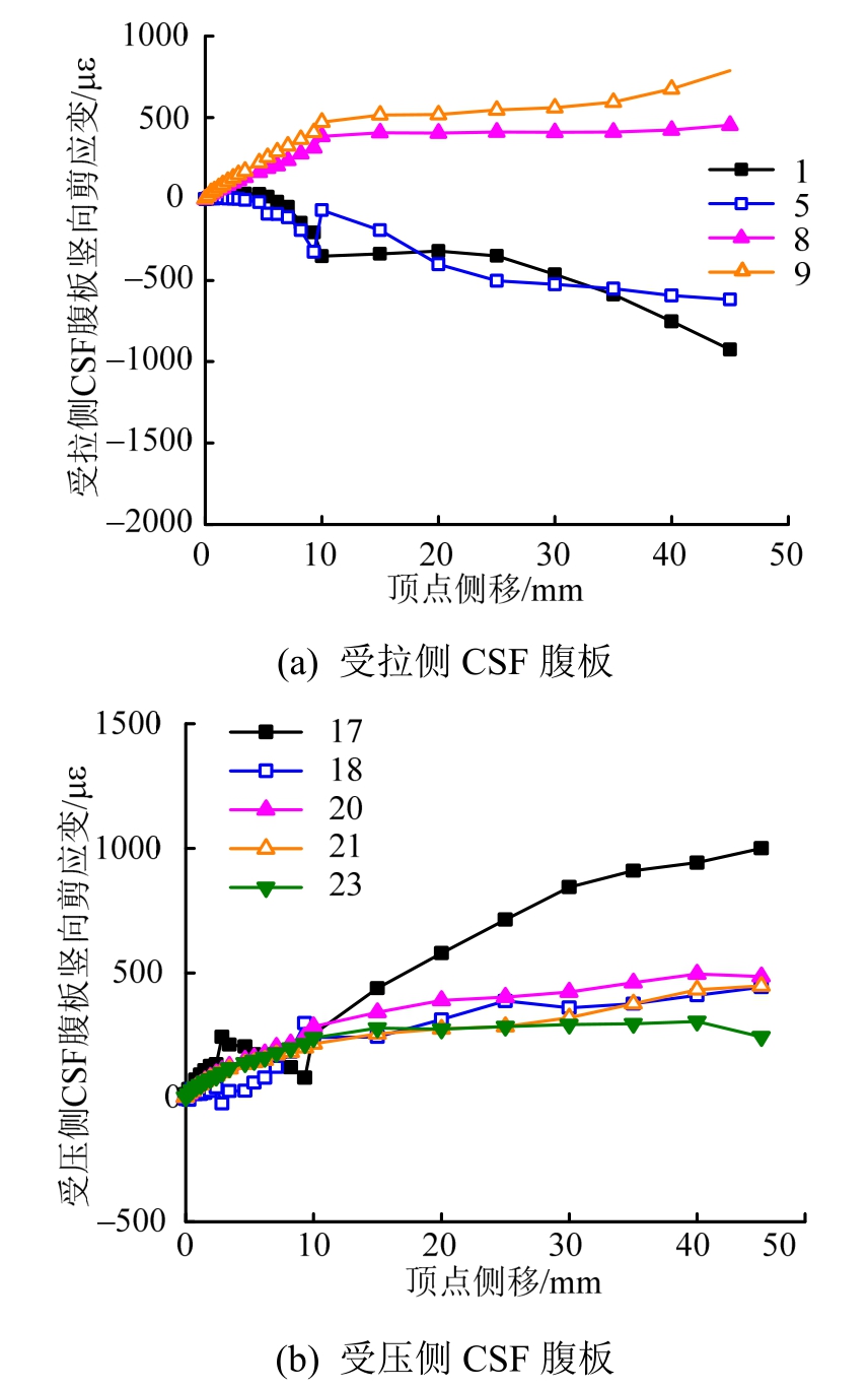 试件WV-r1~WV-r3中连接钢框的竖向剪应变-顶点侧移关系曲线分别如图17~图19所示。连接件制作误差对应变分布造成了一定程度的影响,但从图17~图19仍可以看出:1)受拉侧CSF腹板上部剪应变明显大于下部(图18(a)、图19(a)),表明受拉侧连接钢框的竖向剪力传递区域主要位于上部,受拉侧CSF翼缘竖向剪应变的分布规律类似于腹板;2)受压侧 CSF腹板下部剪应变明显大于上部,尤其是在试件临近破坏时(图17(b)、图19(b)),与试件破坏部位一致,受压侧CSF翼缘竖向剪应变的分布规律类似于腹板;3)试件 WV-r3中连接钢框的应变总体大于试件 WV-r1、WV-r2,前者大约是后者的2倍,这是因为前者中连接钢框的厚度(3 mm)是后者(6 mm)的一半。