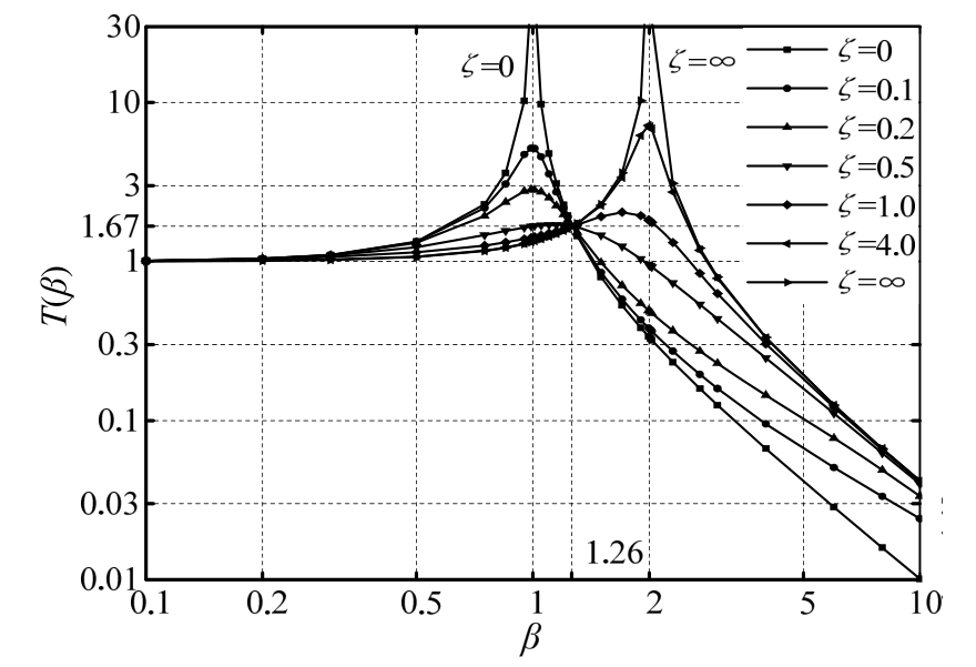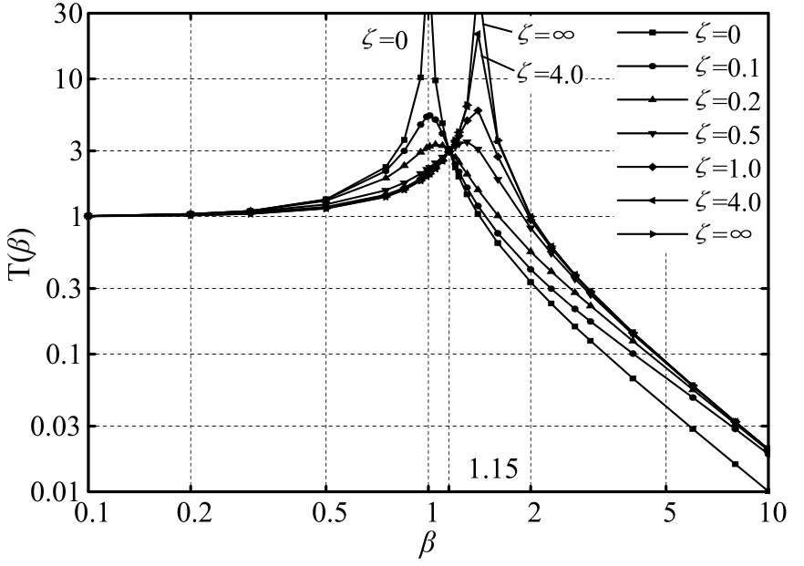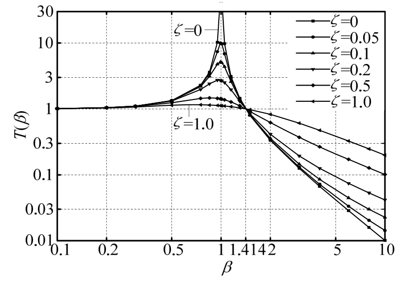 分别选择不同的阻尼比值ζ(取 0,0.05,0.1,0.2,0.5,1.0),按照式(4)计算出的值绘制系统绝对传递率T()β的曲线,横纵坐标均按对数值选取,得到不同阻尼比下体系的频率响应曲线如图2所示。