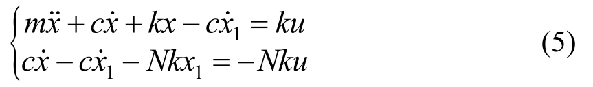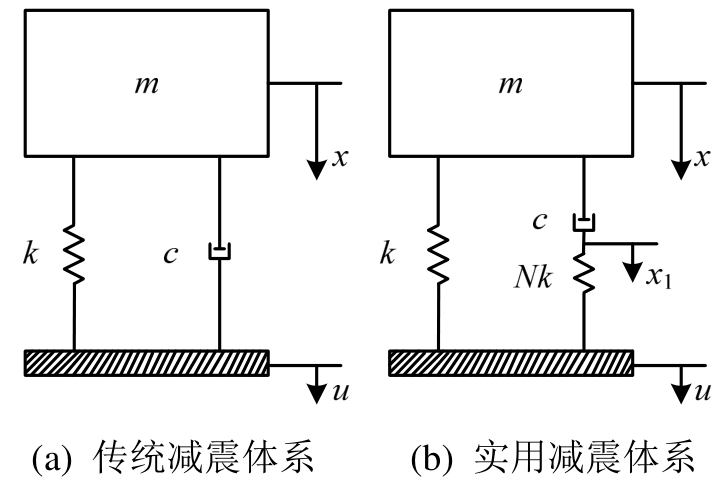 根据结构体系力与位移的基本关系,将连接构件与阻尼器串联起来,再放置于减震体和支座之间,便能得到图1(b)所示的实用减震体系简化力学模型,该力学模型有的学者称之为松弛型减震体系[22]或1.5自由度体系[24]。图中用附加弹簧刚度Nk(N定义为支撑刚度系数)为连接构件的刚度,x1为阻尼器与附加弹簧连接点的位移,其他参数同图1(a)。根据达朗贝尔的动平衡原理,建立图1(b)减震体系的运动方程: