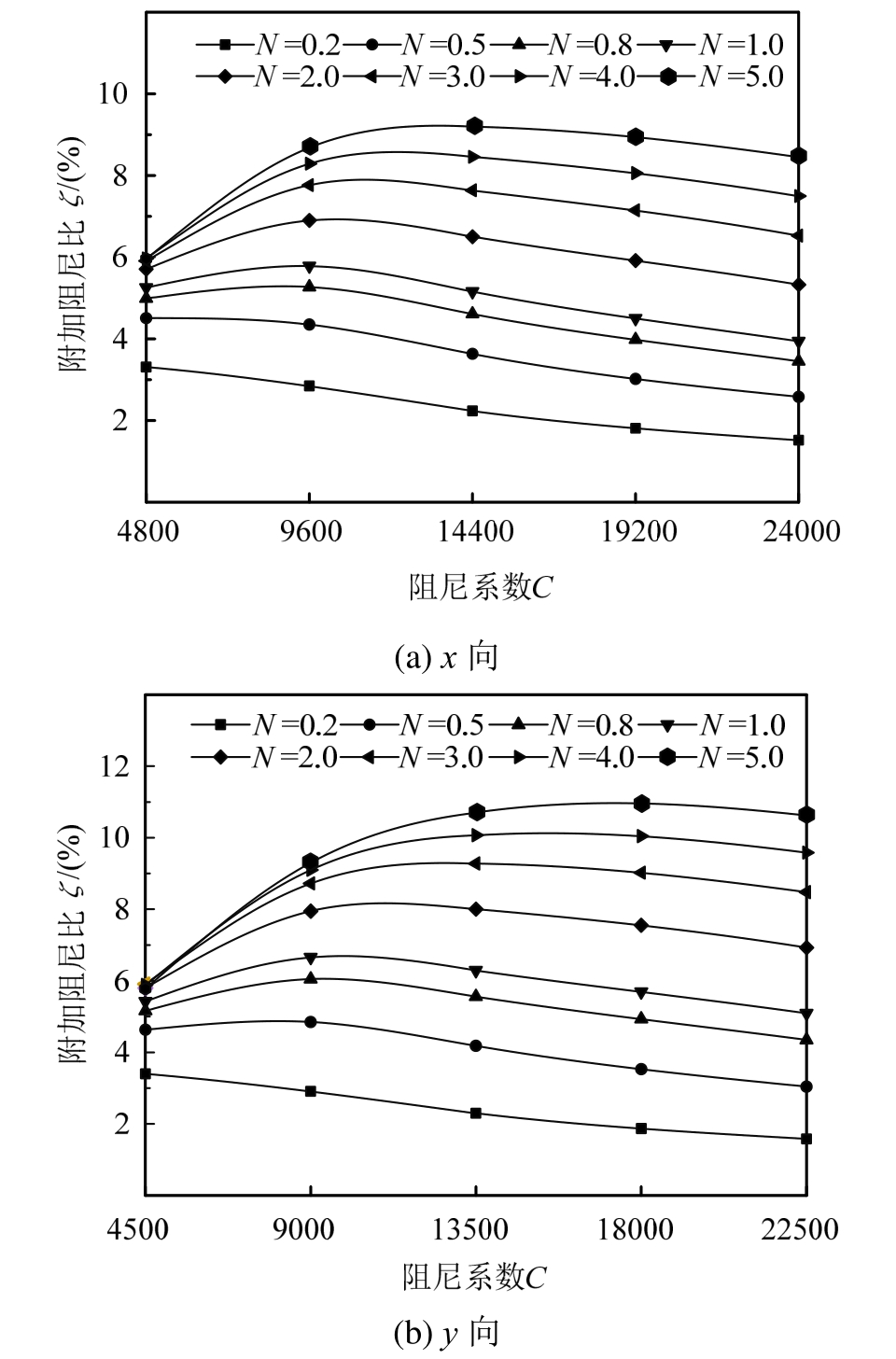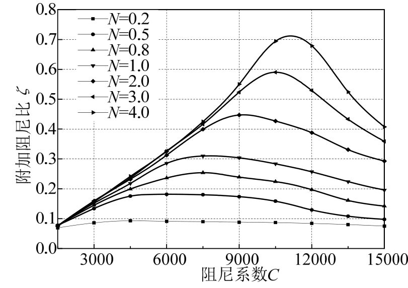2)当阻尼系数相同时,随着支撑刚度系数 N的增加,结构的附加阻尼比逐渐增大;当支撑刚度系数较大时随阻尼系数的增加结构的阻尼比增加并不显著。