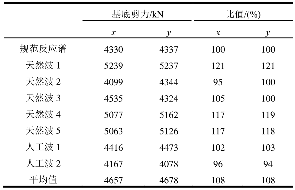 然后,按照《建筑抗震设计规范》第5.1.2条[1]的要求选取 5条天然波和 2条人工波进行时程分析,时程分析的基底剪力与反应谱分析的基底剪力与之比满足规范要求,所得结果如表3所示,图12给出了7条地震波的归一化时程曲线。
