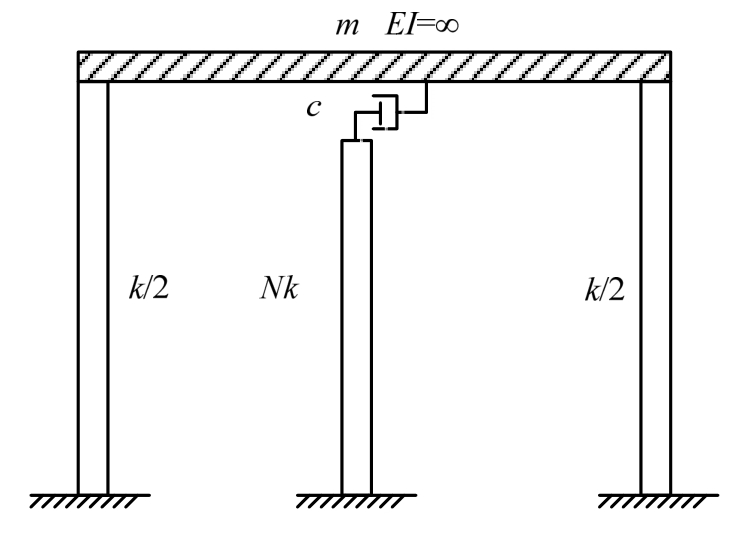 图9为一梁刚度无穷大,质量为m,刚度为k的单自由度体系,假定梁和柱无轴向变形和剪切变形。首先考虑不同支撑刚度系数N时的最优阻尼比ζopt(如表1所示),表中的比值为后一个Ni+1与前一个Ni对应的理论最优阻尼比之比。