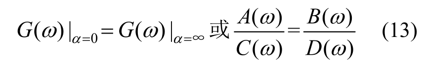 当 α=0、α=∞(即 ζ=0 和 ζ=∞)及 α 为任意值时,频率响应曲线的交点与α无关,该交点就是频响曲线中的定点,是任意阻尼比下频率响应曲线均通过的点。定点的求解可由下式决定: