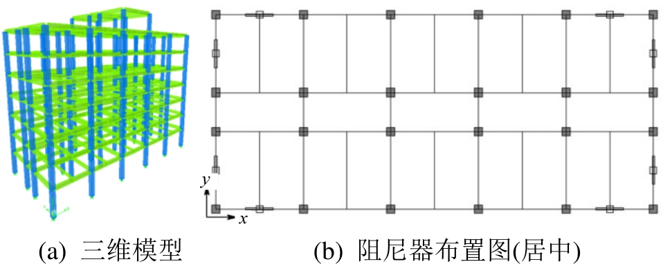 某钢筋混凝土框架结构(如图11(a)所示),该结构地上 7层(不含屋顶层),无地下室,首层层高4.2 m,屋顶层层高3.3 m,标准层层高为3.6 m,结构总高度25.8 m。抗震设防烈度为8度(0.20 g),场地类别为Ⅱ类,设计地震分组为第三组,场地特征周期为Tg=0.45 s。柱截面主要截面尺寸为700 mm×700 mm、600 mm×600 mm,梁截面尺寸主要为300 mm×600 mm、400 mm×600 mm;与阻尼器相连的消能子结构梁柱截面分别为 400 mm×600 mm和700 mm×700 mm;跨度沿x方向为7500 mm,y方向为 6600 mm。结构总质量 5562 t,自振周期1.06 s,周期折减系数0.80。