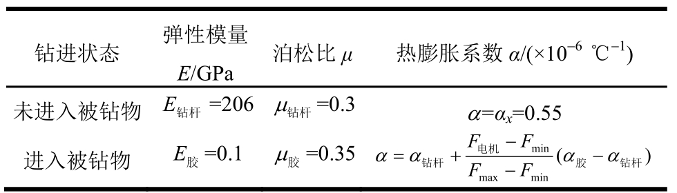 注:α钻杆为螺纹钻杆的热膨胀系数(10×10-6℃-1);α胶为胶黏剂的热膨胀系数(100×10-6℃-1);F电机为某一时刻的电机施加压力;Fmax为电机施加的最大压力;Fmin为电机施加的最小压力。节点位置进入被钻物后,热膨胀系数介于螺纹钻杆和胶黏剂之间,随着电机施加的压力增大,胶黏剂受温度和外力的影响越大,热膨胀系数越趋向于胶黏剂热膨胀系数。