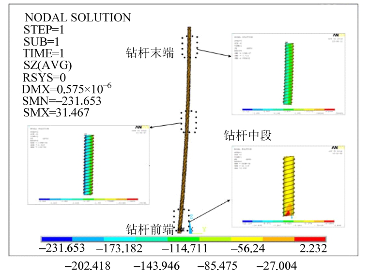 对螺纹钻杆在复合载荷作用下的受力状态进行有限元仿真,设螺纹钻杆以 120 rpm转速与130 mm/min进给速度钻进被钻物中;钻具材质的E=206 GPa,μ=0.30,仿真中采用的单元类型为solid95;在螺旋线起点位置建一个螺纹钻杆截面(尺寸参见表1),对其划分网格,在ANSYS中以该截面沿螺线扫掠拉伸成体方式建立螺纹钻杆模型,划分的总单元数为159912个。仿真结果如图2所示,螺纹钻杆前端(靠近钻头一侧)、中段和末端受力状态各不相同。根据仿真结果与钻进经验,实验中在螺纹钻杆的前端、中段和末端各选一节点,共3个检测节点,对钻进过程中螺纹钻杆所受复合载荷同时进行在线检测。