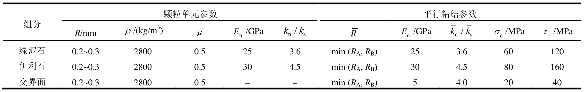 本文使用颗粒元平行粘结模型,在细观层面模拟岩石材料的力学性质。平行粘结模型假定颗粒间以接触点为圆心的圆盘上存在一系列平行弹簧,可以在颗粒间传递力和力矩,当作用在平行粘结上的最大拉应力达到法向粘结强度或最大剪应力达到切向粘结强度时即认为粘结断裂,颗粒发生破坏。颗粒单元间的作用及粘结模型的讨论可参考文献[18―19]。模型计算时需要利用参数反演技术确定岩样中各组矿物的细观力学参数,相应的步骤如下: