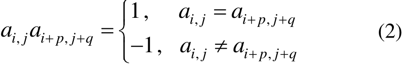 假定二维空间内包含两相介质,生成随机的数组 A,数组内的单元 a i , j =±1, i = 1,2,…,n;j = 1 ,2,… ,n ,其中1和-1代表两相介质,假设两相介质含量不相等,分别为w和1-w(0<w<1)。两个单元之间的相关关系满足式(2)的条件,若为同一介质值为1,否则为-1,即: