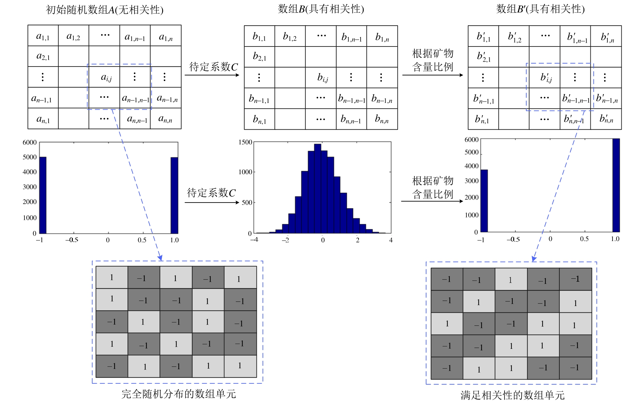 综合式(7)和式(8),可列出式(9)。式(9)为多元非线性方程组,共 ( n+1) 2 个方程,相应地,可求解出待定数组C,从而得到满足相关函数分布的数组B(这里给出的是没有各向异性情况的推导,考虑各向异性时只需要按照式(6)更新有效距离的计算即可)。根据给定的两相介质比例,对整个随机场进行修正,得到符合已知空间相关特性且满足既定两相介质比例w和1-w的数组B′。