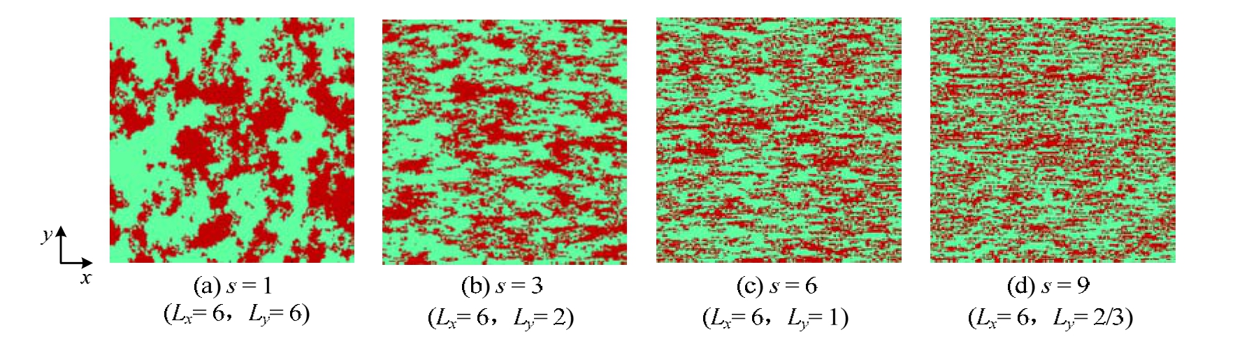 为考虑不同各向异性参数对细观结构的影响,在图3(c)的基础上(取x方向的空间相关长度L x =6),分别取各向异性参数 s=1、3、6、9,则根据式(5)可以确定y方向的空间相关长度L y =6、2、1、2/3,随机生成的样本如图4所示。可见,当各向异性参数s取1时,两相材料沿x、y方向的关联性保持一致,在随机场内形成块状聚集;随着各向异性参数的增大,两相材料沿y方向的关联性减小,变化程度逐渐剧烈,材料沿x方向仍保持原有的聚集程度,即随机场沿x、y方向为不同程度的凝聚,使得材料在空间内呈现明显的各向异性特征,各向异性参数愈大,这种特征愈为突出,可较好地表征诸如板岩、片麻岩等片状结晶岩石的细观结构。