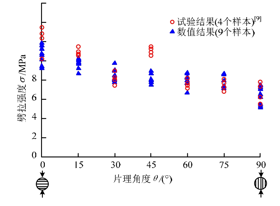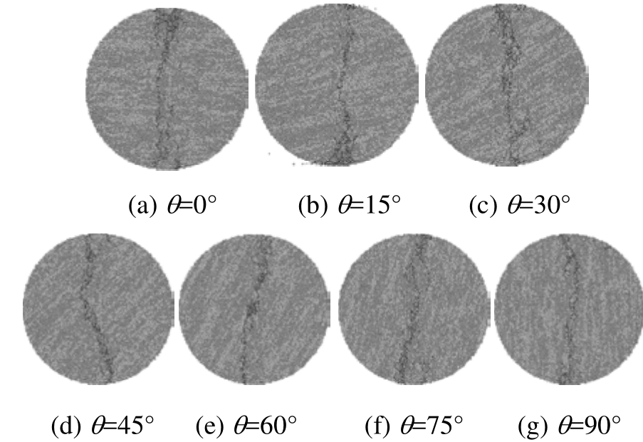 为了研究片理角度对板岩劈拉力学行为的影响,本文基于上述巴西劈裂试验数值模拟方法,设计了7组不同片理角度,分别为θ = 0°、15°、30°、45°、60°、75°和 90°,每组片理角度按 Monte Carto法产生9个随机样本。
