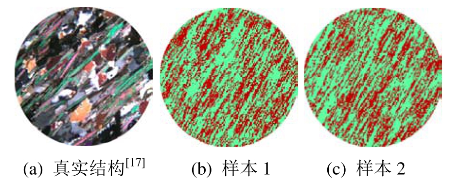本次数值模拟将板岩视为由绿泥石和伊利石组成的各向异性材料,参考相关资料 [17] ,假定二者含量分别为60%和40%。对比岩石真实的微观结构,取L=6.0和s=6.0,按照1.3节的方法,随机生成9个具有板状特征的岩石细观结构,如图5(b)、图5(c)所示。可见,绿泥石与伊利石矿物有明显的聚集特征,且沿着某一方向延伸分布,不同矿物之间的定向排列构成了特定方向的片理结构,基于该方法构建的细观模型考虑了岩石不同矿物成分、矿物成分含量及岩石的微观结构分布特征,更接近真实结构。相对于常规的单独模拟出片理结构的方法,本文的方法可以更好地反映实际岩石结构分布特征,且该方法拓展至多相矿物具有良好的操作性。