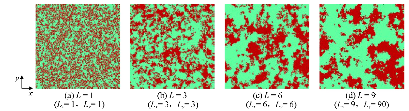 当不考虑细观结构的各向异性时(s=1,即L x 和L y 沿 x和 y方向的空间相关长度相同),分别取L x =L y =1、3、6、9,随机生成的样本如图3所示。显然,不同空间相关长度对材料的细观结果具有显著影响。当空间相关长度较小(图 3(a))时,两相材料结构变化程度相当剧烈;随着空间相关长度的增大,材料的相关性增强,表现为随机场中同相材料的不断聚集,呈现一定的连续性(图3(b)~图3(d))。选取适宜的相关长度,可较好地表征诸如花岗岩、玄武岩等块状结晶岩石的细观结构。