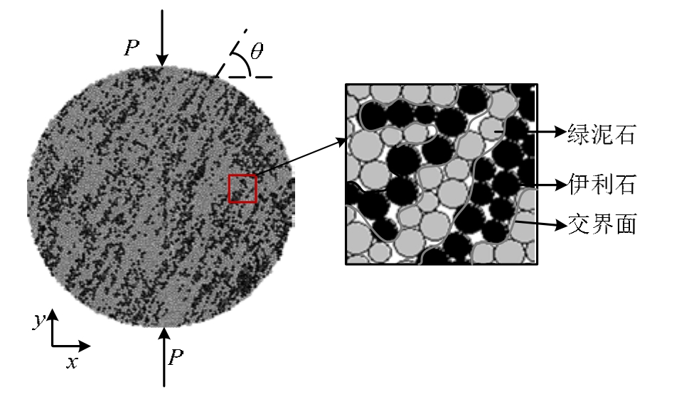 巴西圆盘劈裂试验相比点荷载、多点弯曲、直接拉伸试验,具有操作简便快速、试验成本低等优点,是目前应用最广泛的岩石抗拉强度测试方法,已广泛应用于砂岩、板岩、页岩等层状岩石各向异性行为的研究中 [5―10] 。随着计算机技术的发展,数值仿真技术日新月异,逐渐形成反映岩石微细观组分及排列结构的细观力学模型。Debecker等 [11] 采用二维离散单元法对板岩进行了压缩与劈拉试验数值模拟,研究了板岩的破裂特征。谭鑫等 [12] 采用UDEC程序建立离散单元数值模型,利用随机分布的条状块体集合,通过设置层理界面和矿物颗粒之间的接触参数,模拟层理构造对片麻岩破坏的影响。Kim等 [13] 在数值模型中定义定向排列的层理结构,并赋予相应的微观参数,研究了砂岩在单轴压缩条件下的各向异性行为。Park等 [14] 在离散单元模型中设置平滑接头模拟岩石的片理结构,通过与片麻岩、板岩及片岩的试验结果比较,验证了模型的可靠性。但现有数值方法普遍定义矿物组分的力学属性为随机分布,或者将岩石的片理结构简化为某一方向的长条状分布形态,忽略了层状岩石结构本身的多相矿物组分、矿物成分含量及不同矿物定向排列形成的片理微观结构分布特征。