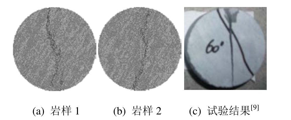 选取刘运思等 [9] 做的巴西劈裂试验,其中,试件直径为 50 mm(长径比 1∶1),片理角度为 60°,试件选取湘西地区的板岩。基于上述思想和方法,建立具有片理构造特征的PFC 2D 颗粒离散元数值模型,结合细观参数反演技术,开展岩石破坏过程的仿真计算与分析。