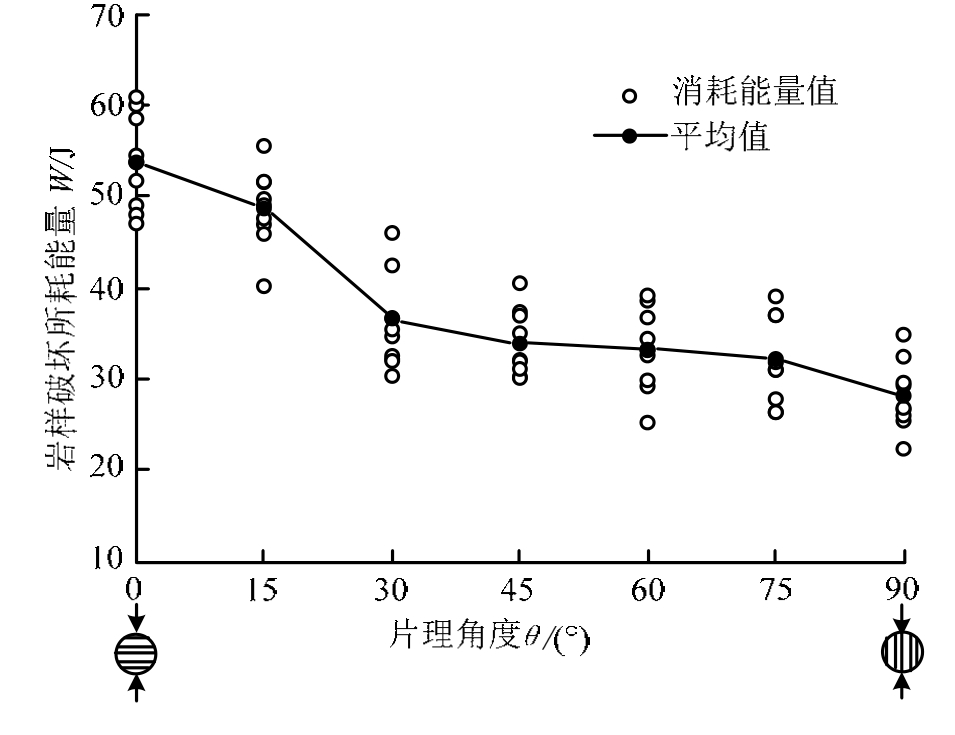 在PFC 2D 中,可获取试件外力做功的总能量W,由此,得到不同片理角度下数值岩样达到失稳破坏时所消耗的总能量(见图9),其中,耗损能量W的定义详见PFC用户手册 [23] 。可见,在外荷载的作用下,外力做功转变为颗粒间积累的能量,当积累能量超过片理面强度或不同矿物颗粒之间的粘结强度时,颗粒之间发生断裂。随着θ值的增加,岩样破坏所耗能量呈现整体下降趋势(由 53.49 J降至28.15 J)。当片理角度较小时(θ=0°~30°),数值岩样的破坏需要突破矿物基质本身的粘结强度,而矿物之间的粘结强度大于片理结构面的强度,因此,岩样在这一片理角度下发生断裂破坏所消耗的能量较多,岩样的裂纹将穿越矿物基质与片理面,最终形成一条沿加载方向的裂纹。随着片理角度的增大(θ=45°~75°),岩样的破坏是拉伸和剪切综合作用的结果,由于片理结构弱面的影响,岩石破裂所需消耗的能量会有所降低。而当片理角度增大至 θ=90°时,岩样为沿着片理面的拉伸破坏,此时消耗的能量最低,相对θ=0°时降低了45%。