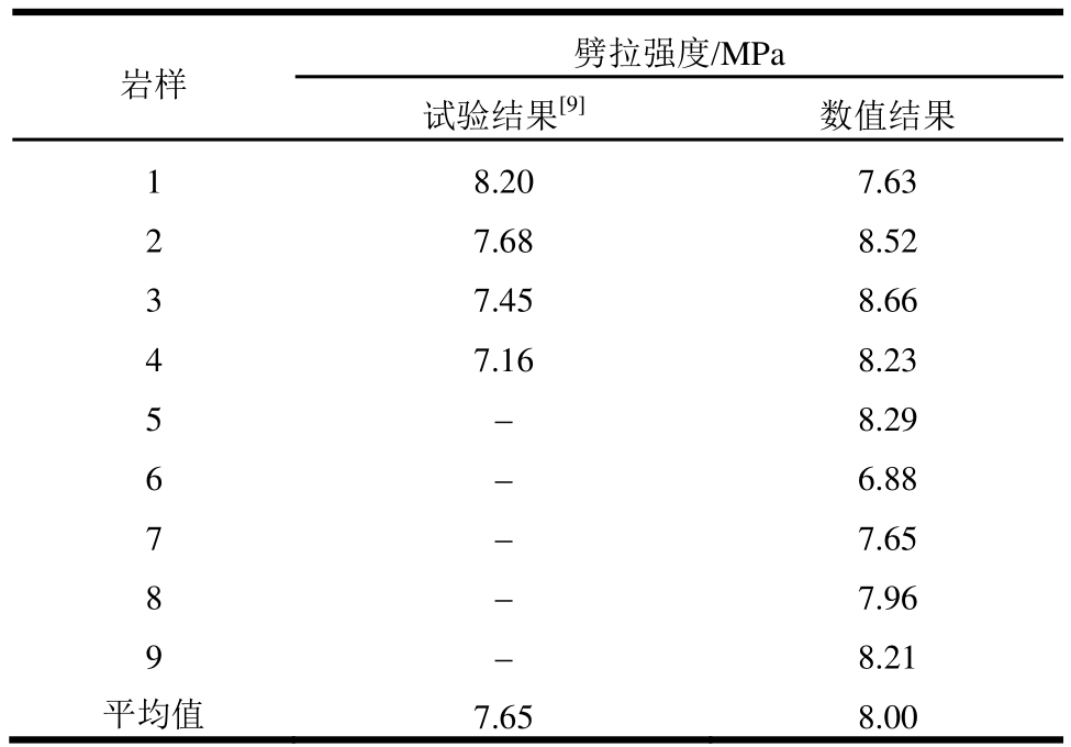 3)9个样本的劈拉强度与试验结果具有良好的可比性,岩样细观结构的矿物分布形态不同使得数值仿真结果呈现一定的离散性,其离散范围较好地反映了板岩劈拉强度的离散性。