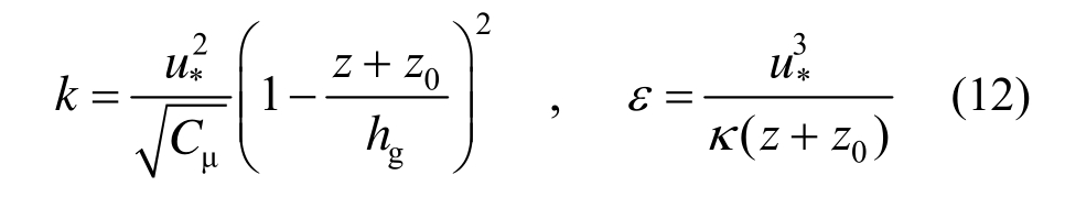 式中:hg表示大气边界层高度,取909.56 m;标准k-ε中湍流参数:Cμ=0.03,Cε1=1.21,Cε2=1.92,kσ=1,εσ=1.3。