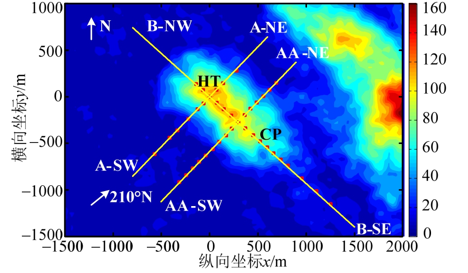 如图2所示,该山及周围区域的地形等高线云图,整座山的形状似椭圆。粗糙度长度为 0.01 m~0.05 m,平均粗糙度长度为0.02 m~0.03 m。在此项目中,设立了分布于A、B和AA三条线上的约50座测风塔,其中大部分高度是 10m。line-A和line-AA的方向为 N43°,line-B的方向为 N313°。山顶点 HT的坐标为(075383,823737),山体中心点CP的坐标为(075678,823465),参考点RS的坐标为(074300,820980),在HT点西南方向约3 km处。本文选用TU03-B实测数据作为对比数据,来流风向为N210°,该试验数据多次被应用于风场数值模拟研究[22―23]。
