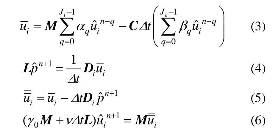 为方便读者理解,下面给出采用高阶时间分裂离散、谱元法空间离散后得到的矩阵形式方程,通过式(3)~式(6)依次解出压力场和速度场的展开系数: