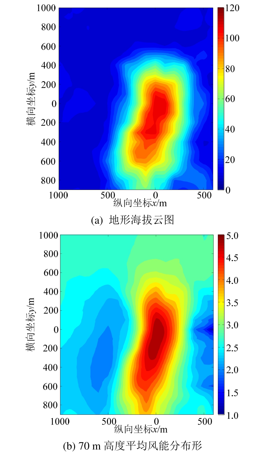 现有的风机通常有70 m和150 m两种高度类型,根据Askervein山地形特点,主要对比70 m高度处的风能资源分布。图6给出70 m高度处Askervein山附近的平均风能资源分布图,从图中可以看出,风从入口进入,在山体前风速变小,可利用风能变小,随着山体的高度增加,风速逐渐增大,可利用风能增加,在山顶附近可利用风能最为丰富,从山顶到背风面,由于分离再附等现象,风速逐渐减小,可利用风能变少。对于本次工况而言,风机的最优布置区间为HT点的顺风向[-300 m,200 m]、横风向[-800 m,400 m]的范围内,作为为风机最优排布的参考。