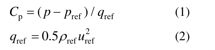 由于存在相对变加速度,这里也采用包含动压指标q的压力系数Cp对非线性气动效应进行分析。Cp按式(1)定义,其中p为颗粒壁面绝对静压,pref为参考静压,根据远场值取为 0 Pa。qref为参考动压,按式(2)定义,参考密度ρref取为空气密度1.225 kg/m3。考虑颗粒运动速度的时变性,这里给出两种定义方式下的参考速度uref:其中uref,1统一取值1 m/s;uref,2按当前颗粒运动时刻所对应的x方向沉降线速度Ux取值(如图7(a)),并规定初始时刻静止颗粒Cp,2=0。