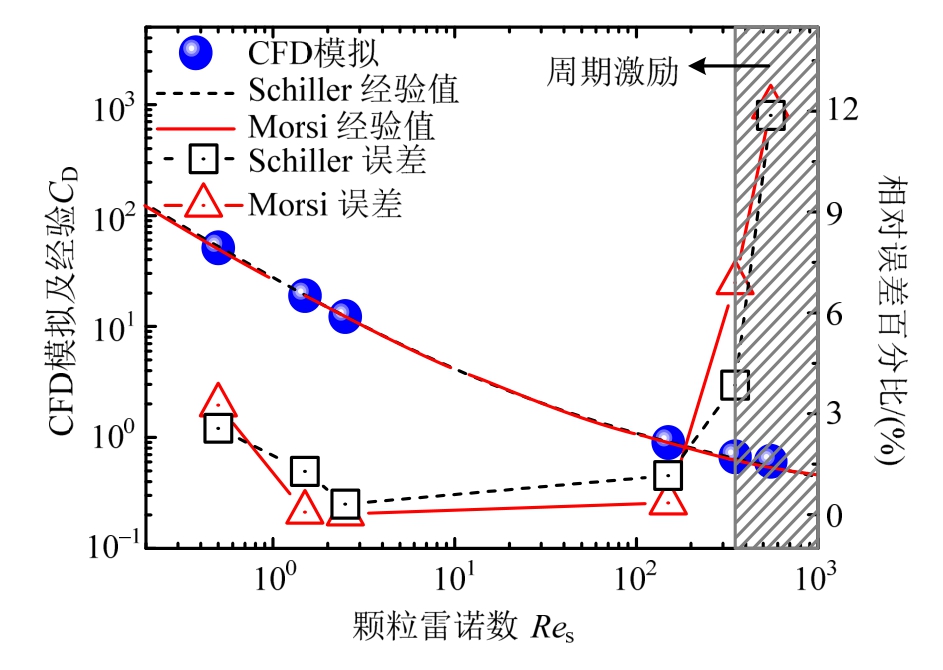 将图2的计算颗粒气动阻力时程按Res换算后并与Schiller等和Morsi等[14]的经验阻力系数曲线进行对比,结果如图4所示。可见,CFD模拟结果与两种经验分布值在低Res区间内几乎没有任何差异,但对于较高Res情况,模拟结果较Schiller等与Morsi等的分段拟合值均略为偏大,总体上,计算颗粒阻力系数随Res的变化规律与两种经验函数较为一致。同时,就模拟结果与经验值的相对偏差来看,当Res<150时,相对误差均在5%以内,而当Res超过350后,误差迅速增大,这可能与计算所选用的流场模型为 laminar层流模型有关。但针对一般风吹雪问题,由于颗粒粒径多在微米量级,均匀流下Res达到350时,介质与颗粒的相对流速已超过34 m/s,因此,这里近似认为研究所选用的流场模型及参数设置对模拟常规风雪流滞空颗粒的运动行为基本有效。