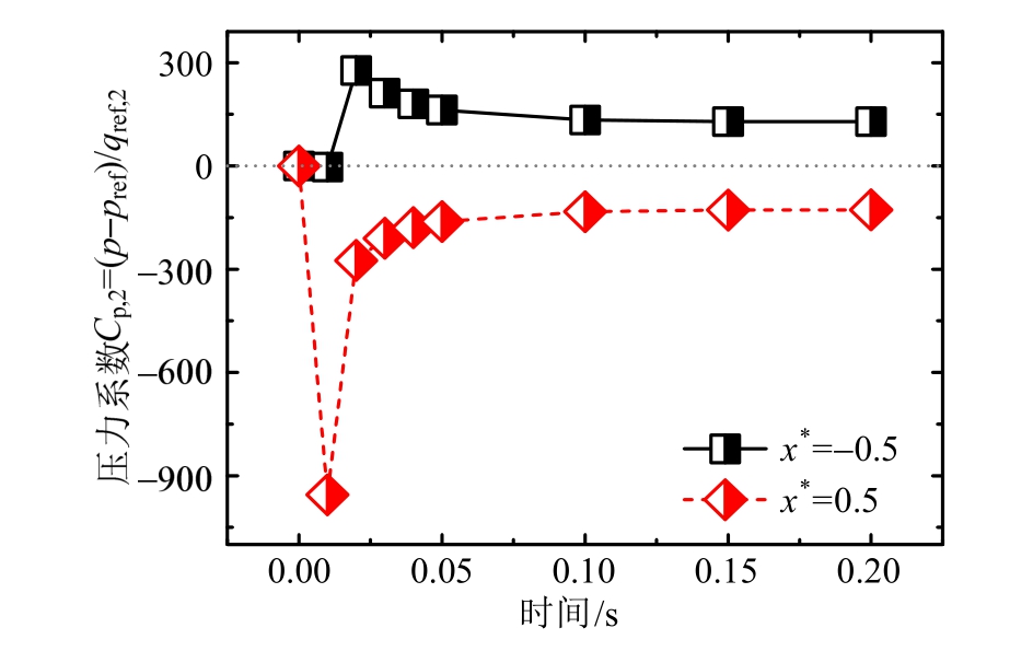 图 12为提取颗粒驻点及分离点绝对压力系数Cp,2随时间的变化规律。由于采用颗粒当前沉降速度计算qref,Cp,2在相对低速的运动初期取值最大。t=0.01 s时,背风端点x*=-0.5处Cp,2量值显著小于迎风端点x*=0.5处量值且同为负值,这一现象与Cp,1完全一致。表明在t=0.01 s以前,颗粒受自重作用加速沉降所“携带”的迎风气流回流尚未完全“抵达”背风壁面,介质的运动及发展部分滞后于颗粒,进而呈现出复杂的非线性气动特征。